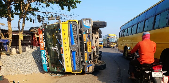 టిప్పర్ బోల్తా- తప్పిన ప్రమాదం